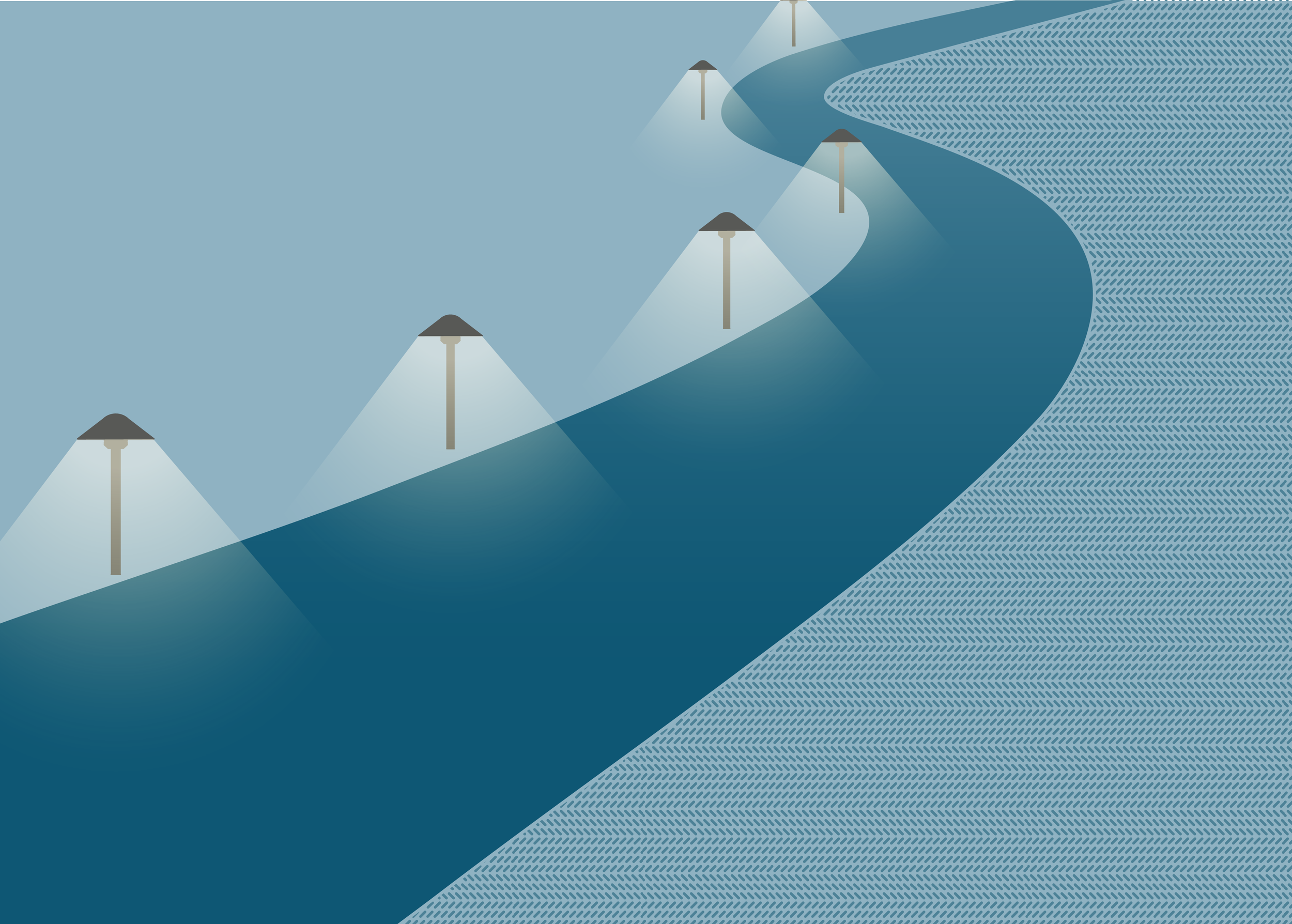 Evening lighting attracts our vision into two distinct areas; the focal glow and the ambient lighting. The focal glow of the brightest areas initially attract our attention and draw our gaze. The ambient lighting is the spaces between the focal points. Creating a lighting system that gently blends these two points of lighting creates gentle illumination of key areas and a harmonious backdrop.